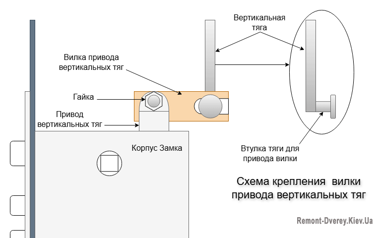 Один из самых удачных способов соединения тяги и привода замка. Достаточно открутить и снять фурнитуру – ручки, сердцевину и броненакладку. После вынимаем механизм, перекручиваем штифты или вилки на новый и устанавливаем в двери. Есть несколько важных моментов: