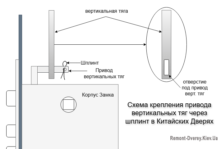 В данную категорию крепления тяг через шплинт попадают двери китайского производства. Тут все гораздо проще, потому как тяги не проваливаются, а всегда фиксируются за счет девиаторов. Снимаем ручки с планками и подсвечивая фонариком полость полотна, увидите место, соединяющее привод механизма и тягу. Достаточно выровнять имеющийся шплинт и вытянуть его длинногубцами. После замены запорного механизма, обязательно возвращаем шплинты на свое место.