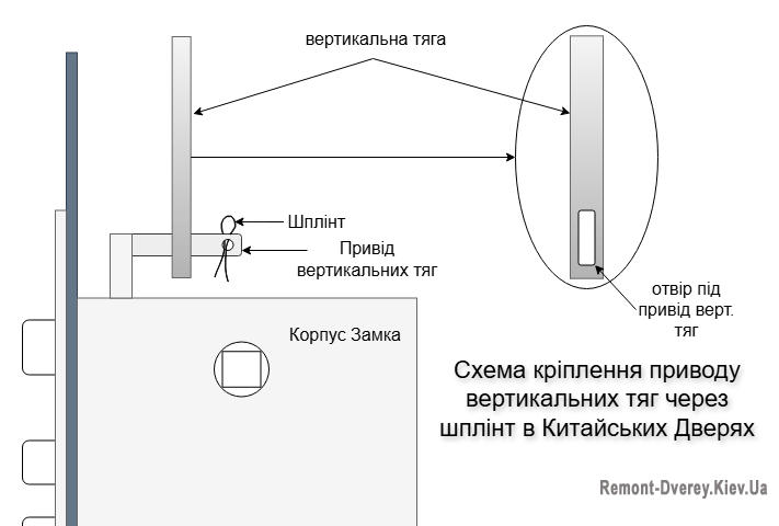 До цієї категорії кріплення тяг через шплінт потрапляють двері китайського виробництва. Тут все набагато простіше, тому що тяги не провалюються, а завжди фіксуються за рахунок девіаторів. Знімаємо ручки з планками і підсвічуючи ліхтариком порожнину полотна, побачите місце, що з'єднує привід механізму і тягу. Досить вирівняти наявний шплінт і витягнути його довгогубцями. Після заміни запірного механізму, обов'язково повертаємо шплінти на своє місце.