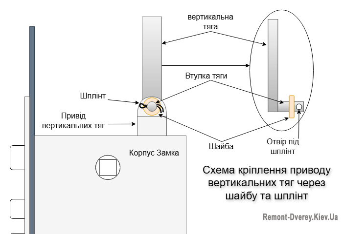 Як і в попередньому способі кріплення (болт-гайка), даний вид з'єднання приводу і тяги, передбачає розбирання полотна. Послідовність робіт буде схожою. Але іноді, розташування тяг знаходиться близько до торця полотна. Тоді відкручуємо торцеву планку замка і за допомогою довгих губців виймаємо шплінт і знімаємо шайбу. Після відключення приводів може виявитися, що тяга не має внутрішньої фіксації і просто провалюється вниз полотна. У таких випадках або виймаємо і забуваємо про її існування, або розбираємо двері для можливості підключення до нового механізму.