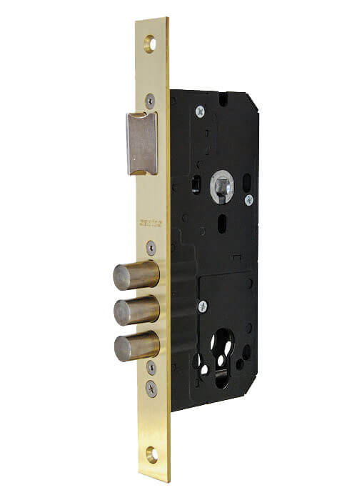Основной замок отличается взломостойкостью и универсальностью в монтаже (правая и левая установка). Предназначен для использования с европрофильными цилиндровыми механизмами, оснащенными шестеренчатым приводом. В изделии реализована трехканальная схема запирания. Предусмотрена возможность отсоединения тяг при установленном в дверное полотно замке. Может использоваться с защитной фурнитурой DIN-стандарта. Оснащен тремя ригелями диаметром 12,7 мм и реверсивной стальной защелкой. Выход ригелей составляет 25 мм, защелки 13 мм, а вертикальных тяг – 25 мм. Межцентровое расстояние равняется 85 мм. Показатель BackSet – 65 мм. Торцевая планка хромированная. Вертикальные ригели в комплект не входят.